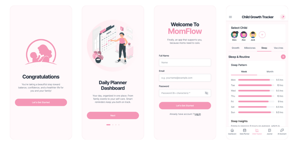 A mobile app designed to support new moms with daily planning, journaling, growth tracking, and a 24/7 AI assistant. Developed using FlutterFlow with integrated AI, real-time updates, and subscription features for a seamless wellness experience.